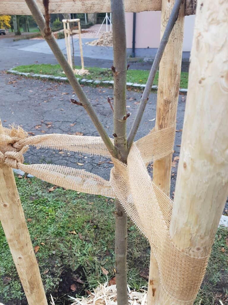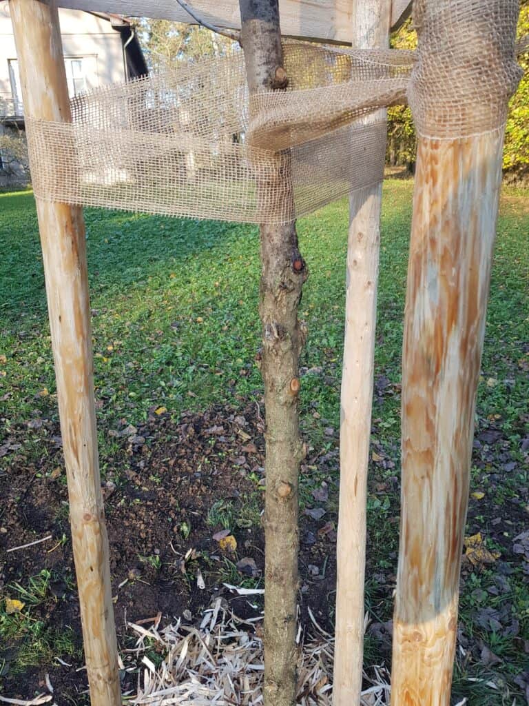 Dřevina ke kůlu musí být vyvázána ve ¾ své výšky. U většího stromu jeden kůl nestačí. Ohrádku složenou ze tří kůlů a třech příček, dáváme ke každému silnějšímu stromku. Ohrádka zajišťuje stabilitu stromu a nové kořínky jsou v bezpečí.